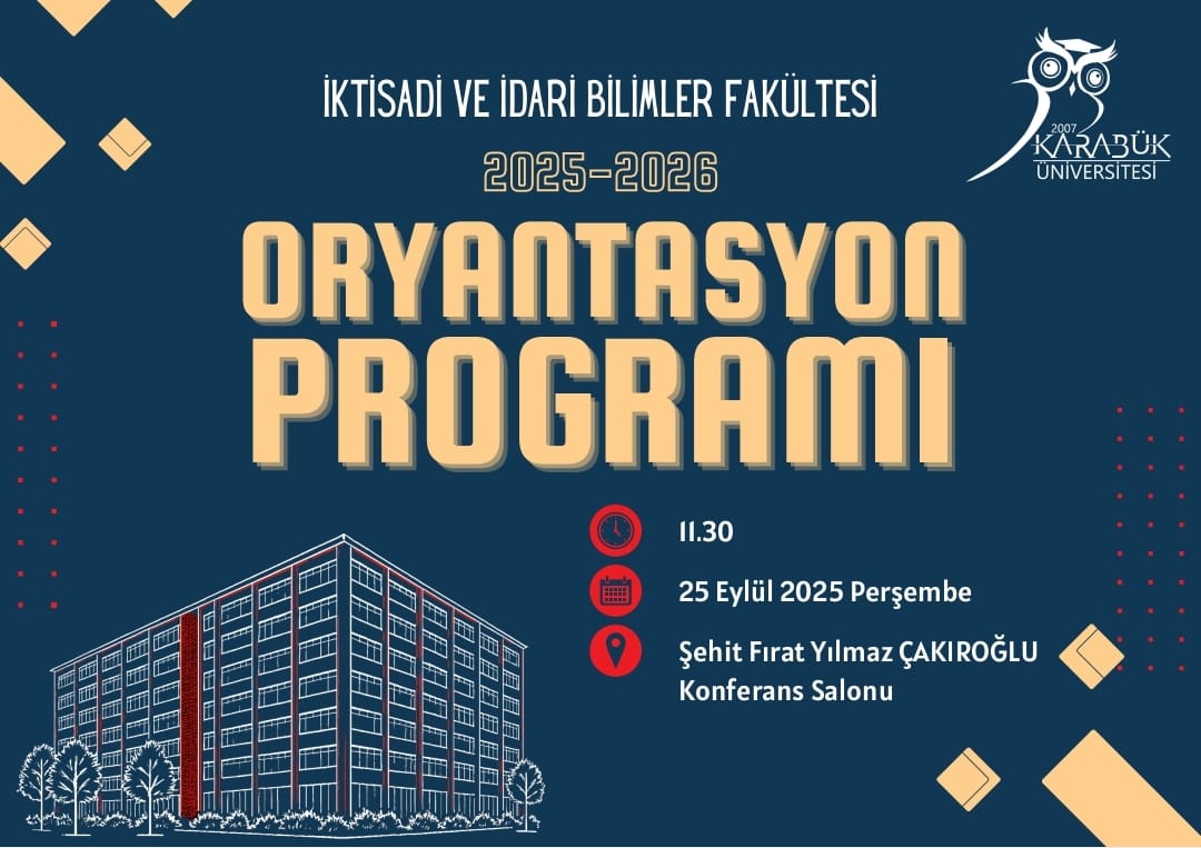 Fakültemizde 25 Eylül 2025 Perşembe günü saat 11:30'da Şehit Fırat Yılmaz ÇAKIROĞLU Konferans Salonunda 1.sınıf öğrencilerimize yönelik olarak oryantasyon programı düzenlenceltir.
