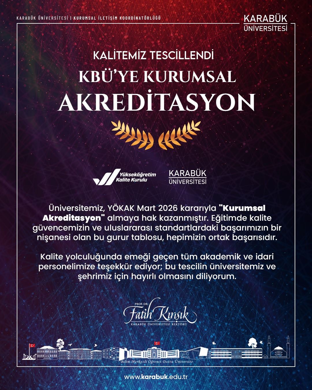 “Üniversitemiz, YÖKAK Mart 2026 kararıyla ‘Kurumsal Akreditasyon’ almaya hak kazanmıştır. Eğitimde kalite güvencemizin ve uluslararası standartlardaki başarımızın bir nişanesi olan bu gurur tablosu hepimizin ortak başarısıdır. Kalite yolculuğunda emeği geçen tüm akademik ve idari personelimize teşekkür ediyor, bu tescilin üniversitemiz ve şehrimiz için hayırlı olmasını diliyorum.”